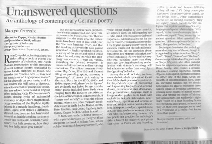 This review – or a shortened version of it – first appeared in The Times Literary Supplement, 25th December 2025. Many thanks to Camille Ralphs for commissioning it. The Opposite of Seduction: New Poetry in Germanis edited by Alexander Kappe, Nicola Thomas, Jana Maria Weiß and published by Shearsman Books, 2025.