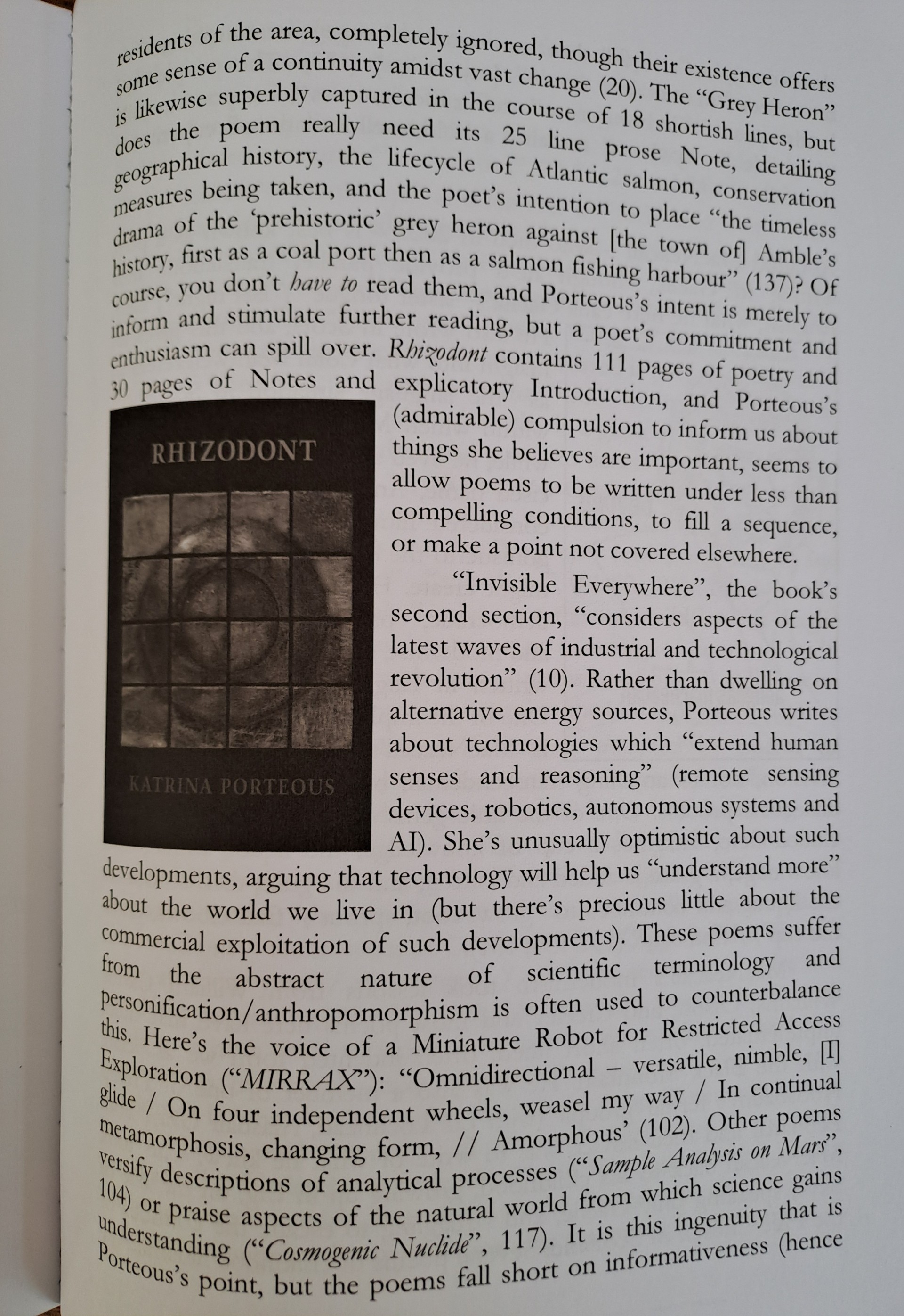 The ‘rhizodont’ which provides the title for Katrina Porteous’ fourth collection (Bloodaxe Books, 2024) is not some niche root-canal dental work, but a large predatory species of fish, which became extinct 310 million years ago. It’s thought to be the first creature to transition from water to land and hence the ancestor of all four-limbed vertebrates (including humans). The poems here are divided into two superficially very separate books (titled ‘Carboniferous’ and ‘Invisible Everywhere’) but what Porteous insists holds them together is her exploration of this notion of transition. As ‘#rhizodont’ puts it, ‘We’re all on a journey’, and the ambition of this book touches upon transformations various: geological, natural, industrial, cultural (and linguistic) and technological. There can be no faulting the ambition of this and there are many fine poems, though Porteous insists on Notes explaining a great deal of what she is doing/writing about which gives the whole a rather teacherly quality that will divide her readership. Here’s the title poem in full, plus a video of the author reading it: