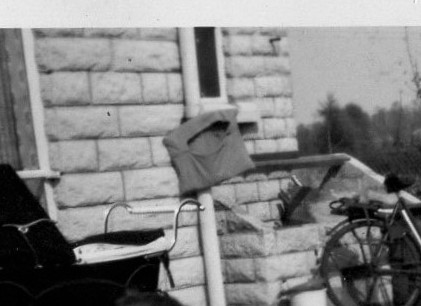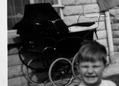 The bicycle? My mother’s of course. A large wicker basket on the front. Look closely and there on the back is the folding child’s seat I remember sitting in as she pedaled the 2 or 3 miles into town. The vast contraption of the black pram? I don’t have memories of it – even of my brother in it. It remains part of the studium – I remember later discussions about the way pram and child would be left outside for hours on end (sometimes in the front garden of the house where the sun’s absence kept it cool in summer). I think a general thought: such a thing would never be countenanced these days. Even far older children are seldom let out of their parents’ sight.