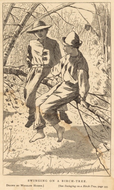 So in ‘Birches’ the narrator remembers – as a boy – climbing slender birch trees, to the top, only to leap out and bend them down with his weight. This swinging of birches can be seen – ulteriorly – as representing Frost’s belief in those negotiated rough zones of a life. We climb up, out of our element, but not too far:
